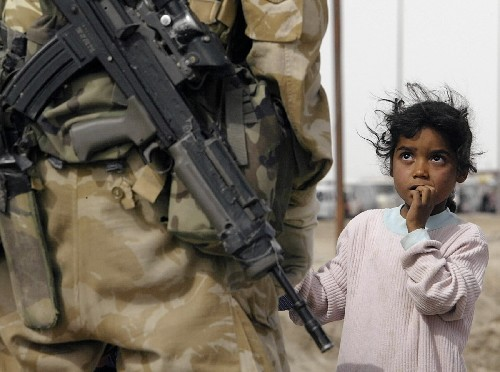 2003年3月27日,在伊拉克巴士拉城外,一名伊拉克女孩惊恐地注视背枪的美军士兵。伊拉克战争是2003年国际社会最重大的事件之一。战争给这个古老国度带来深重苦难。新华社发