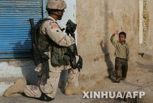 2005年1月31日,美军士兵在伊拉克首都巴格达街头搜捕反美武装人员时,一名少不更事的伊拉克儿童在枪口下向美军士兵挥手致意。新华社/法新