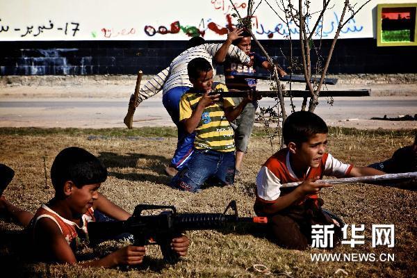2011年5月29日,在利比亚班加西街头,男孩们拿着各式“武器”玩战争游戏。新华社记者才扬摄