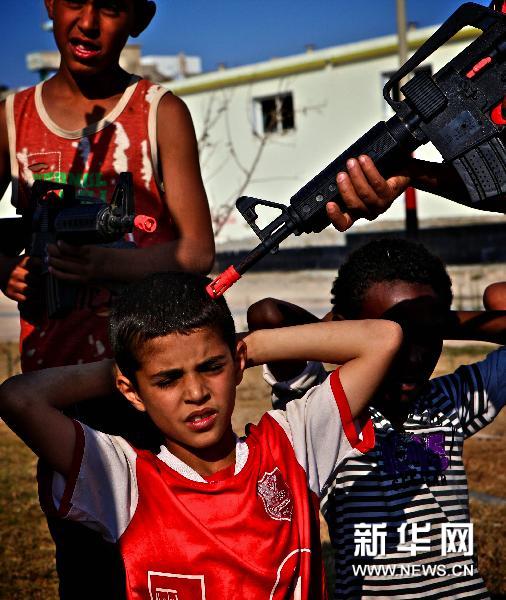 2011年5月29日,在利比亚班加西街头,孩子在战争游戏中被“俘虏”。新华社记者才扬摄