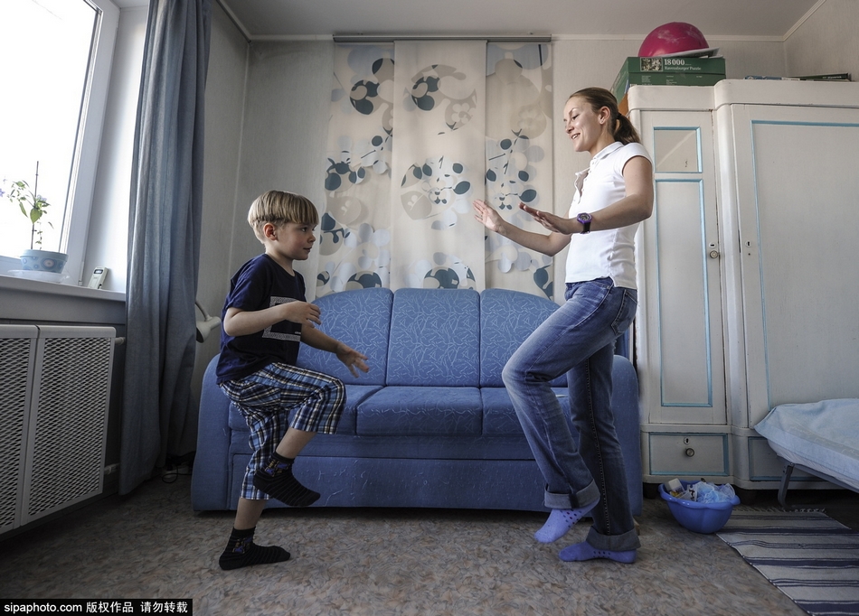 图为自闭症儿童Alexander Bondar和他的母亲Natalya在做体育活动。
