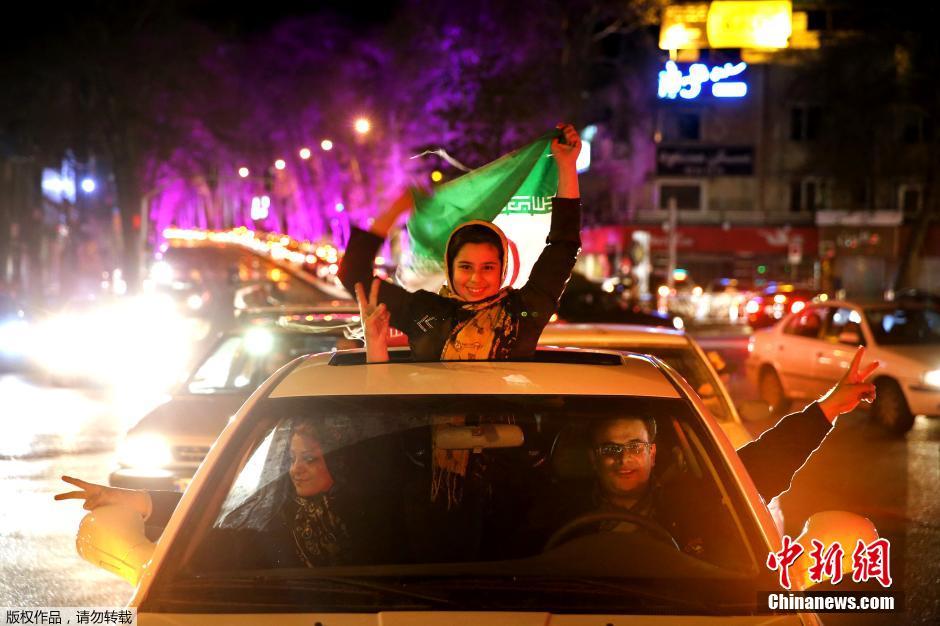 当地时间2015年4月2日,伊朗德黑兰,伊朗人涌入街头狂欢,庆祝伊朗核谈判达成框架性协议。据报道,伊核问题各谈判方当天在瑞士洛桑举行的新闻发布会上宣布,伊朗核谈判达成了框架性协议,该协议要求伊朗限制其铀浓缩活动和相关储备,以换取欧盟解除对其实行的经济制裁。