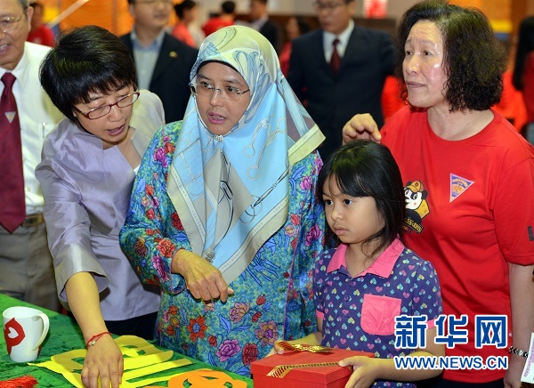 文莱文化、青年与体育部副部长阿迪娜观看文莱中华中学学生的手工作品。记者 郑捷/摄