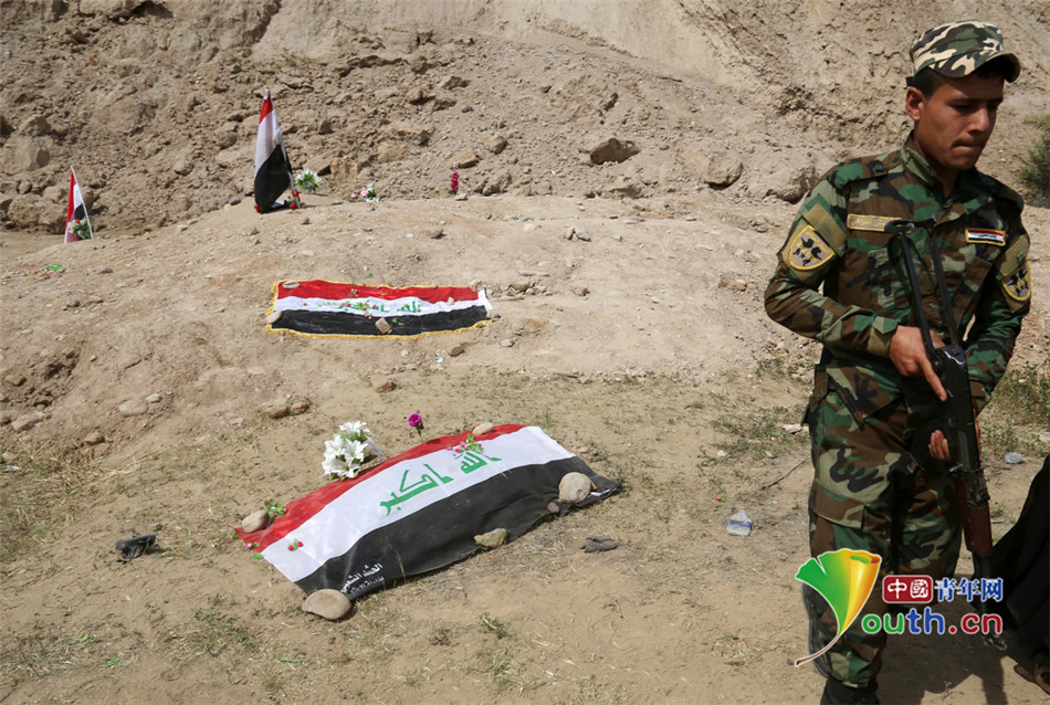 当地时间2015年4月3日,伊拉克提克里特,什叶派武装人员前往当地一座万人坑祷告,据信里面埋葬着惨遭“伊斯兰国”极端组织杀害的伊拉克士兵。