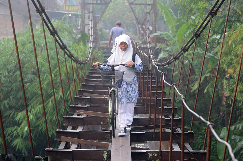 印尼学生惊险上学路 超窄木板吊桥穿丛林(高清组图)