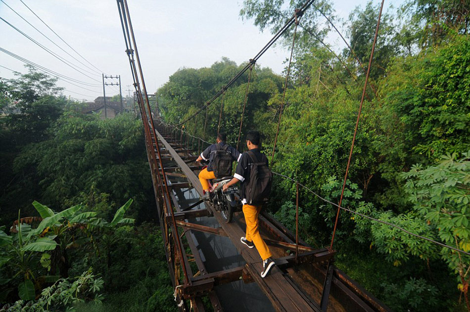 印尼学生惊险上学路 超窄木板吊桥穿丛林(高清组图)