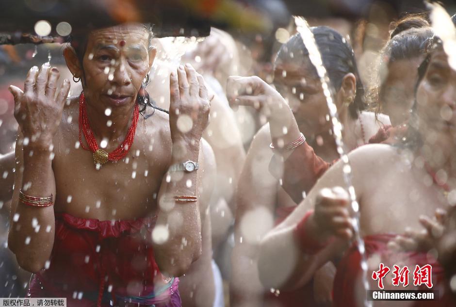 当地时间2015年4月4日,尼泊尔加德满都,白沙克·阿斯南节期间,印度教教徒在巴拉珠泉眼(Balaju Baise Dhara)处沐浴。该处共有纳加琼森林流出的22孔泉水石嘴,信徒认为圣水能够治疗疼痛和皮肤疾病。