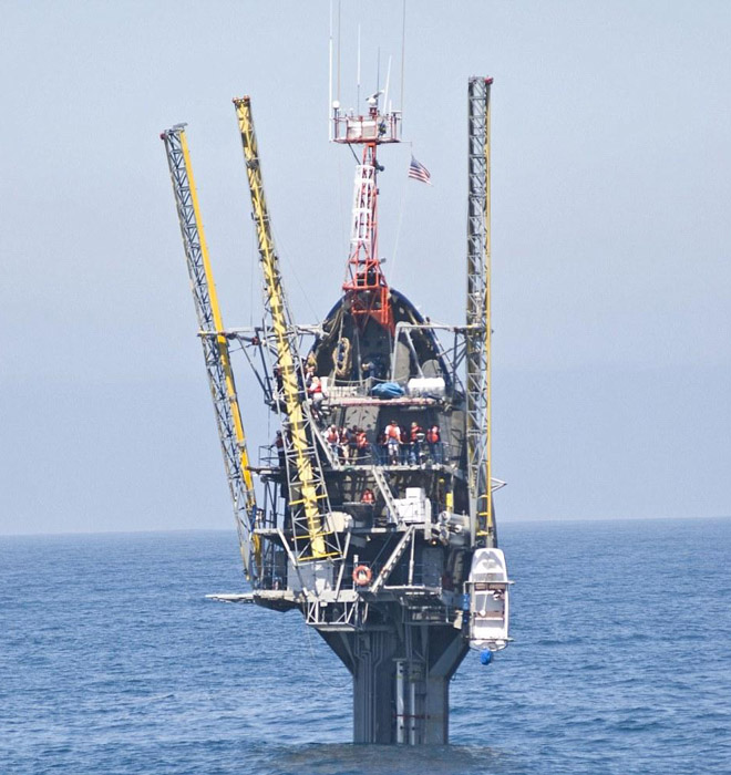 船中配有几个压载水舱,往里面加水,即可改变船身重心,让船90度旋转。当船立起来,研究人员就可以在上面做各种实验。勘测船不仅可以用来测量水温,还可以用来研究水声学、海洋学、气象学和进行对海洋哺乳动物的观测。