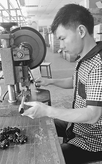 阳光灿烂的午后,海上吹来的风给这里带来些许新鲜的气息。在一座9层高的白色楼房里,冷气吹得很足,工人们双手不停地在不同配件盒上穿梭。钢管、芯片、塑料手柄……十多分钟后,它诞生了。