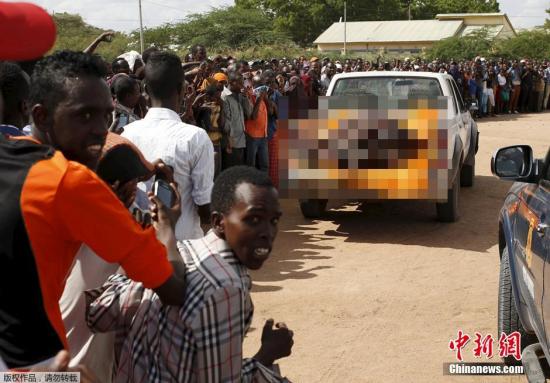 当地时间2015年4月4日,肯尼亚加里萨,司机驾车装载加里萨大学袭击案被击毙袭击者的尸体游街。肯尼亚内政部长于当地时间3日称,日前发生在该国东北部的大学袭击事件的遇难人数已增至148人,4名歹徒均被击毙。