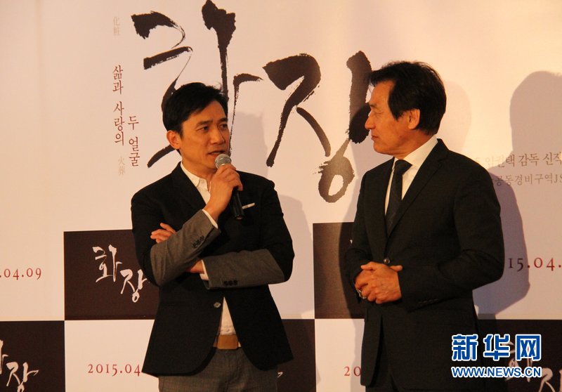 6日,梁朝伟与安圣基在首尔举行的韩国电影《化妆,火葬》VIP试映会上交谈。(新华网记者 彭茜 摄)