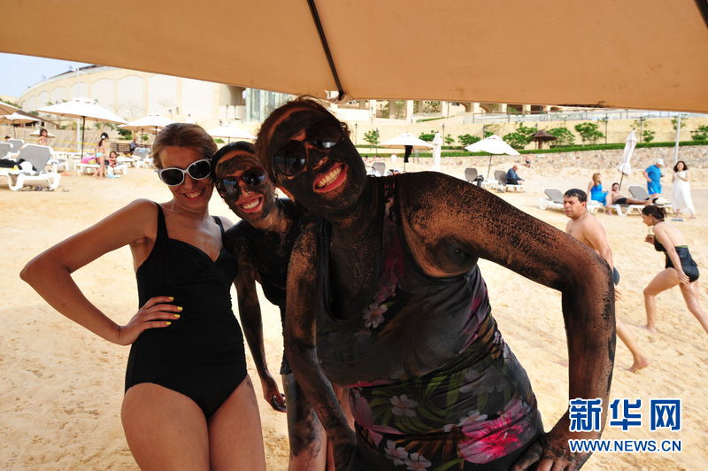 几名游客在体验漂游后抹上死海泥做保健。(新华网记者 程春香 摄)