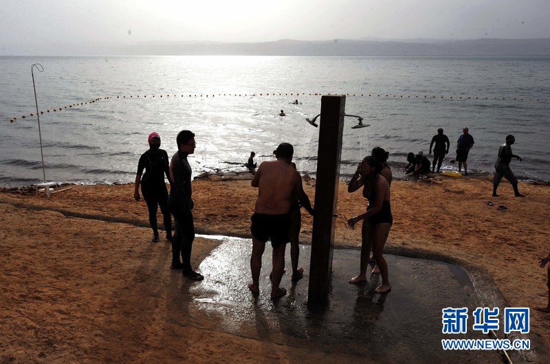 几名游客在漂浮后冲凉。(新华网记者 程春香 摄)