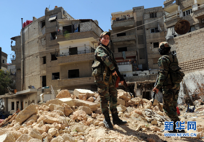 2015年4月4日,在叙利亚首都大马士革郊区达拉亚镇一座建筑外,两名女狙击手准备执行任务。