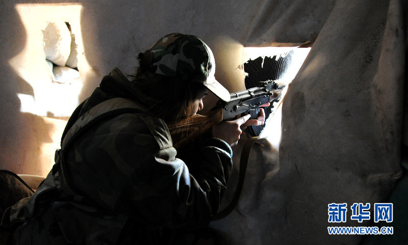 2015年4月4日,在叙利亚首都大马士革郊区达拉亚镇一座建筑内,一名女狙击手通过步枪瞄准器进行观察。