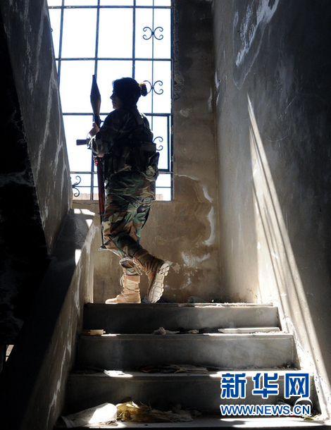 2015年4月4日,在叙利亚首都大马士革郊区达拉亚镇一座建筑内,一名女狙击手走上楼梯,准备执行任务。