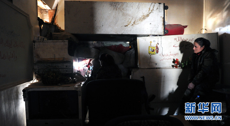 2015年4月4日,在叙利亚首都大马士革郊区达拉亚镇一座建筑内,一名女狙击手准备执行任务。