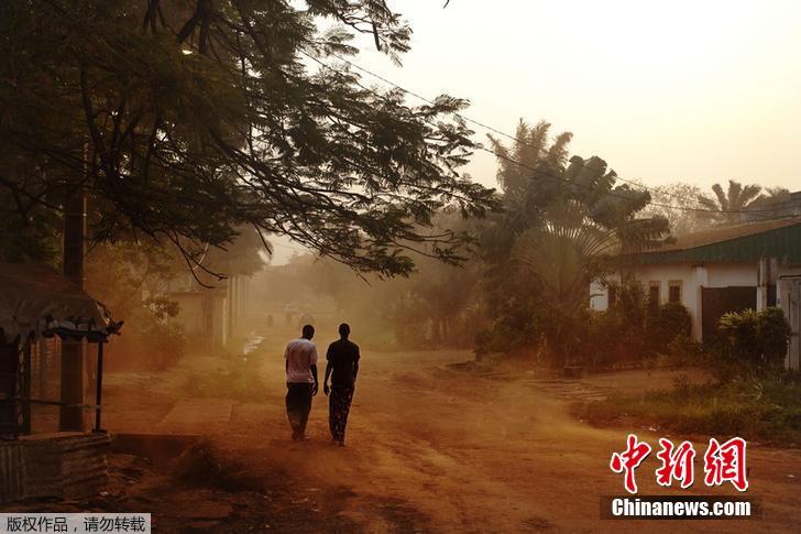 2013年12月1日,中非共和国班吉,两名男子行走在沙尘暴中。