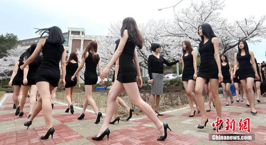当地时间2015年4月7日,韩国大田,一大学模特专业的女学生在樱花树下上课,秀大长腿展示姣好身材。 图片来源:CFP视觉中国