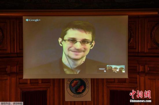 资料图:当地时间2014年12月1日,瑞典斯德哥尔摩,前美国安全员斯诺登通过网络领取了有“诺贝尔替代奖”之称的2014年瑞典“正确生活方式奖”。