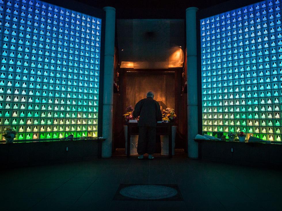 寺庙的长老Yajima Taijun正为死者进行祈祷仪式。