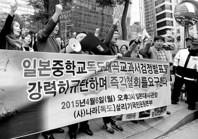 4月6日,韩国首尔,韩国市民团体在日本驻韩国使馆前示威,撕毁记述日本拥有独岛主权内容的日本教科书,抗议日本政府审定通过进一步主张独岛主权的初中历史教科书。 东方IC供图
