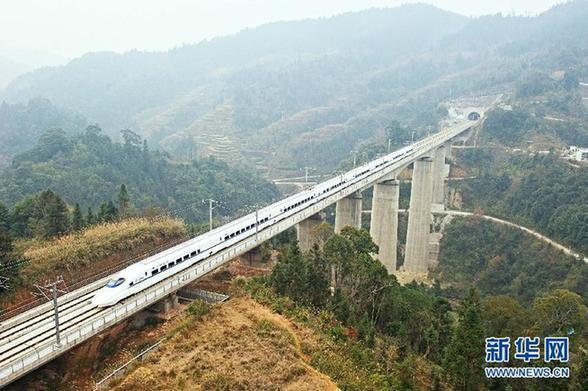 资料图片:2014年12月26日,动车驶过贵州省从江县境内的高架桥。当日,贵广高铁、南广高铁正式开通运营。 新华社记者 刘续 摄