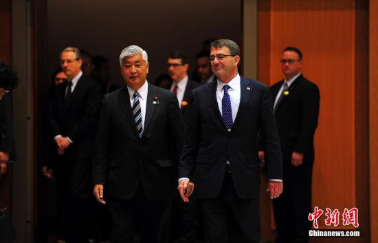 4月8日,日本内阁防卫大臣中谷元在日本防卫省内为阿什顿-卡特举行欢迎仪式。开启任内首次亚太访问行程的美国防长阿什顿·卡特,当天在其此访首站日本东京展开实质行程。中新社发 王健 摄