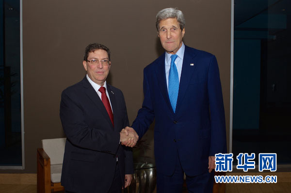 新华网巴拿马城4月9日电(记者叶书宏 毛鹏飞)美国国务卿克里与古巴外长布鲁诺·罗德里格斯9日晚在巴拿马首都巴拿马城会晤,这也是两国断交半个多世纪以来举行的最高外交级别会晤。