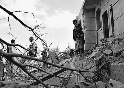 4月8日,在也门首都萨那,人们站在空袭中被炸毁的楼房前。 新华社发