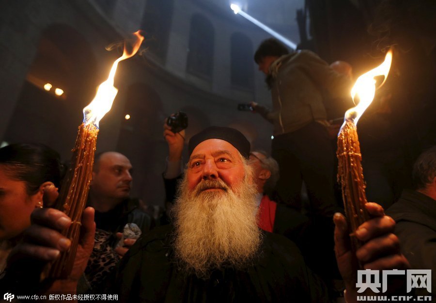 当地时间2015年4月11日,耶路撒冷,数千名基督教徒聚集在教堂参加复活节“圣火”仪式,借圣火点燃蜡烛照亮教堂。