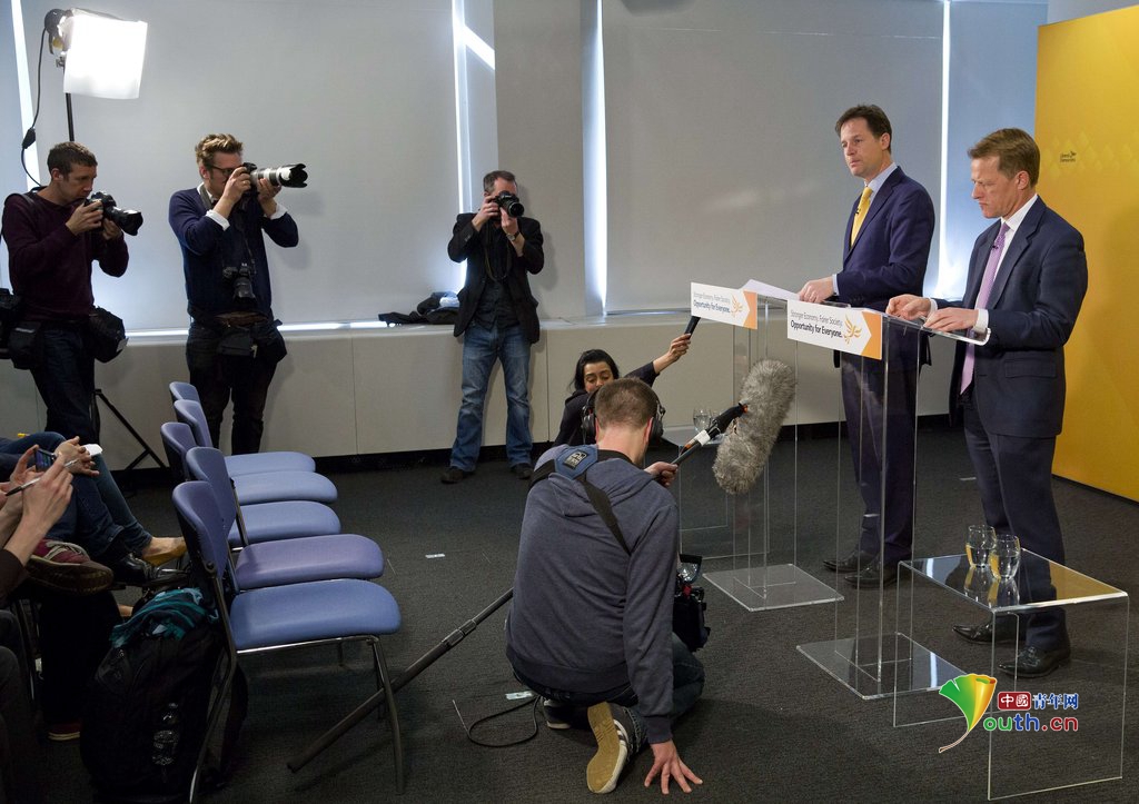 当地时间2015年4月12日,英国伦敦,自民党党魁、联合政府副首相克莱格(Nick Clegg)出席新闻发布会,会上遇技术故障,工作人员跪地举话筒。