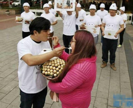 广东一名男子交了一个漂亮女友,因为深怕女神会被其他男人追走,就开始带她品尝各地美食。三餐外加宵夜,一起吃个不停,导致女友从50公斤胖到90公斤。男子很满意自己养出来的成果,在美食街前向他心目中的女神成功求婚。