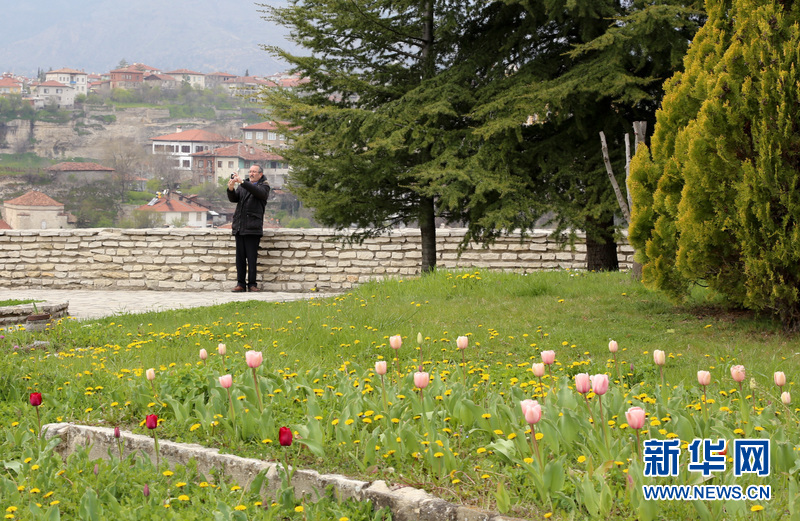 图为一名游客在郁金香盛开的古城观景台,以古城为背景自拍。新华网记者 邹乐 摄