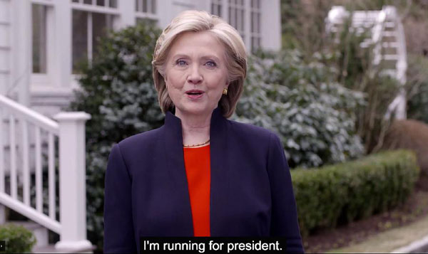 4月12日正式宣布参加2016年美国总统大选。这是2015年4月12日希拉里·克林顿在她的个人网站上发布的总统竞选宣传片的视频截图。 新华社发