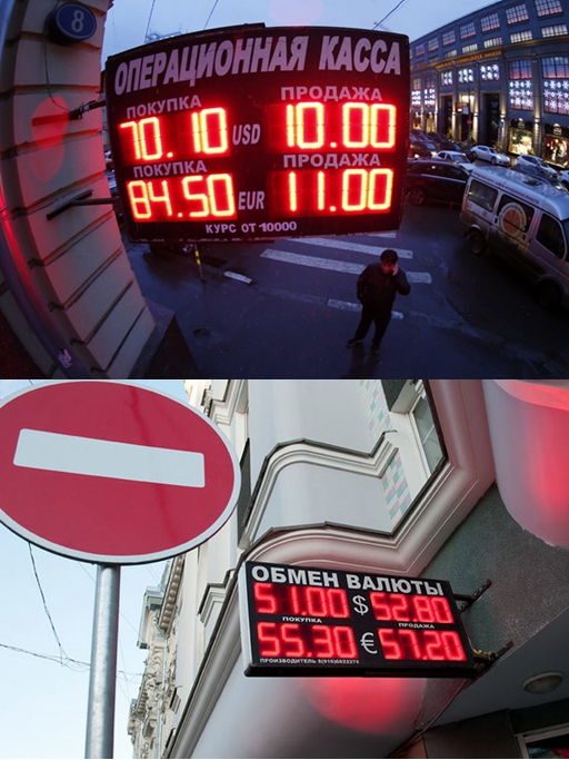 上图为2014年12月中旬拍摄的莫斯科街头外币兑换牌价,卢布汇率一度跌破1美元兑换70卢布的历史最低点。下图为2015年4月中旬拍摄的牌价,卢布汇率已稳定在1美元兑换51卢布左右。