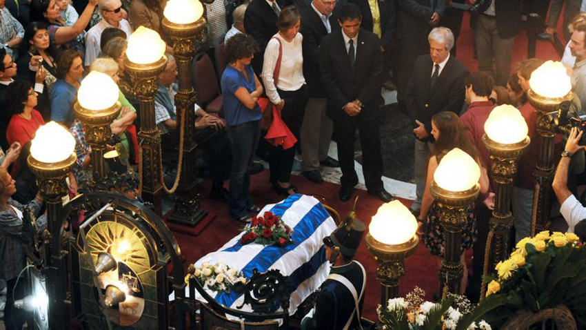 14日,在蒙德维的亚国会大厦,乌拉圭总统巴斯克斯与民众一同向爱德华多·加莱亚诺遗体致敬,总统巴斯克斯在致悼词时说:“我向拉丁美洲这名伟大、杰出的作家致敬,向他辞别。他活在乌拉圭人民以及整个拉丁美洲人民的心中。”巴斯克斯指出: “加莱亚诺留给世界的不仅是他的文学作品,也为他的读者留下了关于政治和道德的遗产。”