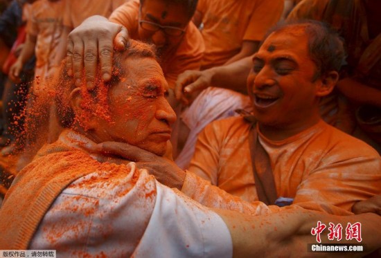 原标题:尼泊尔民众迎接新年 上演“朱砂大战”