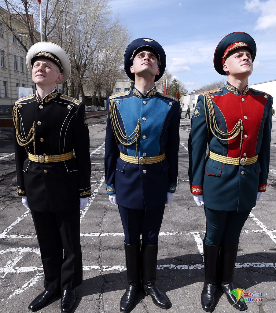 当地时间2015年4月15日,俄罗斯罗斯托夫,南部军区的仪仗队为反法西斯胜利70周年阅兵彩排。