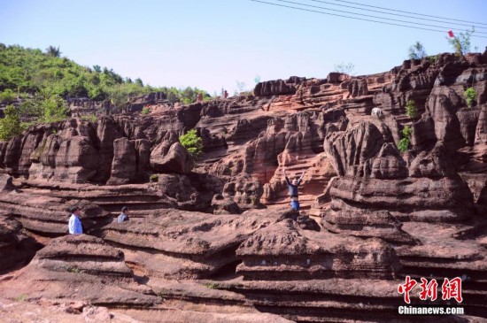 图为红石林吸引游客观赏拍摄。 陈碧生 摄