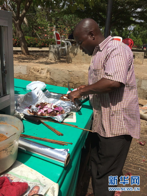 弯刀是很多苏亚店里必备的,熟练使用弯刀的厨师永远能够吸引人们的注意。 新华网发 杨旸 摄
