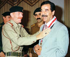 资料图片:伊前政权第二号人物伊扎特·易卜拉欣·杜里(左)在摩苏尔为萨达姆佩戴奖章(摄于1999年5月12日)。