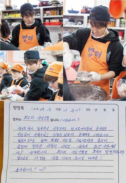 在李准基官方论坛发布的照片中,李准基带着橘黄色围裙、一顶鸭舌帽,正在与粉丝们一同配发餐食,现场氛围其乐融融。