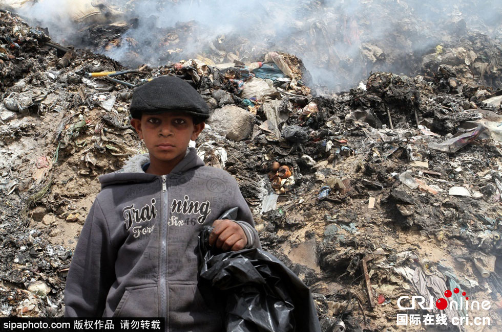 当地时间2015年4月16日,巴勒斯坦加沙拉法地带,巴勒斯坦拾荒者在垃圾场捡拾废弃的金属和塑料卖给以色列或者当地的工厂。许多巴勒斯坦人生活艰苦,从小孩到老人都以捡垃圾为生。图片来源:Sipa Photo
