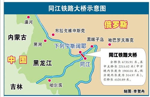 消息称,第一条俄罗斯与中国间跨阿穆尔河的桥梁预计在2015年开工,尽管此前曾有消息表示,建设本应在2014年开始。铁路桥梁通道的建设使得能够在中俄两国之间建立新的出口走廊,并取消自东西伯利亚和远东等新矿产地的货物运输基础设施限制。该铁路通道在实质上提高了货物的周转能力,以及该区域作为俄罗斯生产者及出口者的竞争力。