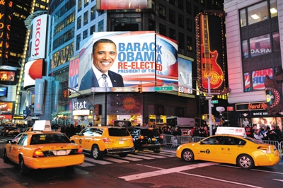 2012年11月6日,美国纽约,时报广场播放大选广告。美国大选中最大头的开销就是电视广告。