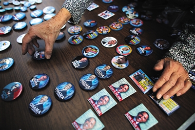 2012年10月,美国纽约曼哈顿,竞选人员展示印有奥巴马的纽扣。竞选团队在招募志愿者、推销候选人时常赠送小礼品,这也是一笔不可小觑的竞选费用。