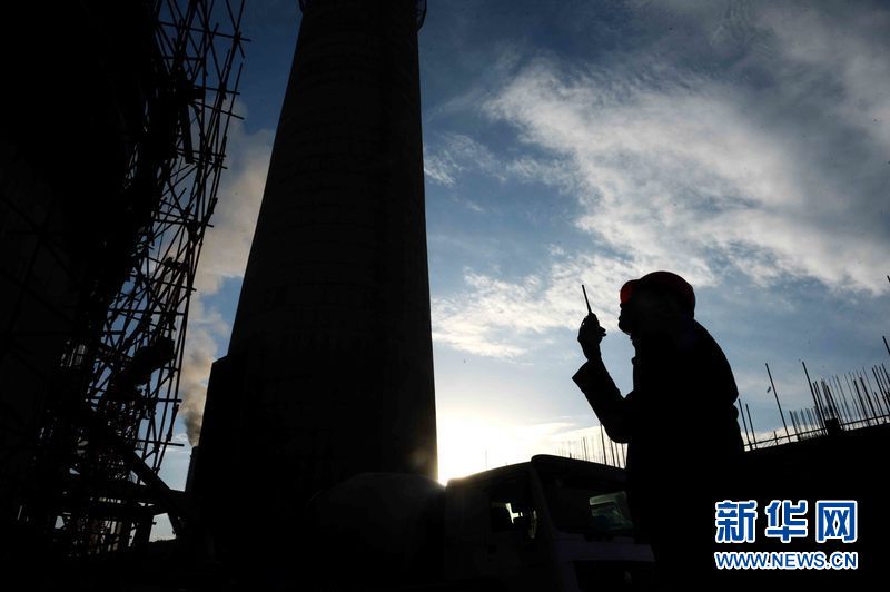 乌兹别克斯坦安格连(市)电厂烟囱施工现场,来自中国能建集团黑龙江省火电第一工程有限公司的工人在作业。新华网发 记者沙达提 摄