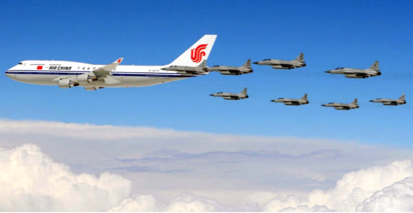 看,照片中习主席的专机身姿飒爽,机身上喷印的五星红旗鲜艳夺目,漂亮的国航标志也很抢眼。在专机两侧,各有4架“枭龙”战机执行护航任务。