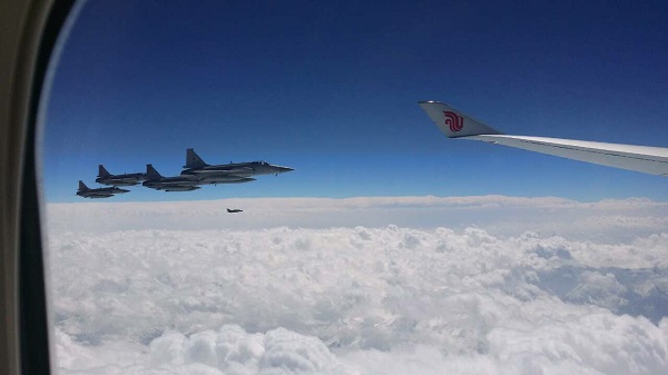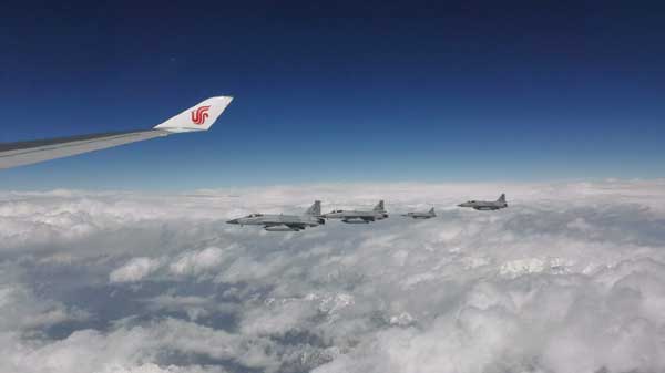 从新华社记者在专机上拍摄的照片中,可以清楚地看到这架“编外”战机。
